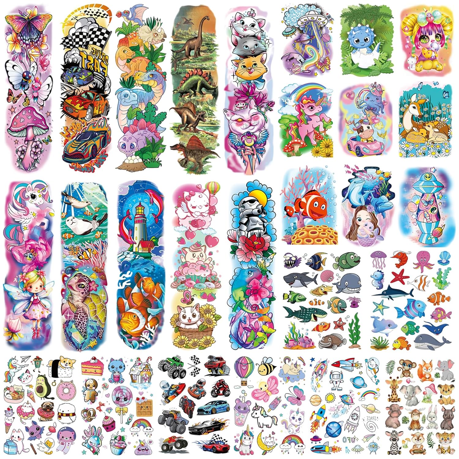 【Full Half Tattoo Sleeves for Kids】There are 27 children's cartoon tattoos, 10 sheets large children's full arm tattoo skids tattoo stickers,9 sheets half arm tattoo for kids,8 sheets dolphins sea creatures mermaids space dinosaurs forest animals racing cute cats dogs and other themes children temporary tattoos,size is 3.54*11/3.54*4.8 inch ,no kid can resist these colorful waterproof fake tattoo stickers,They will bring great fun to children's parties.