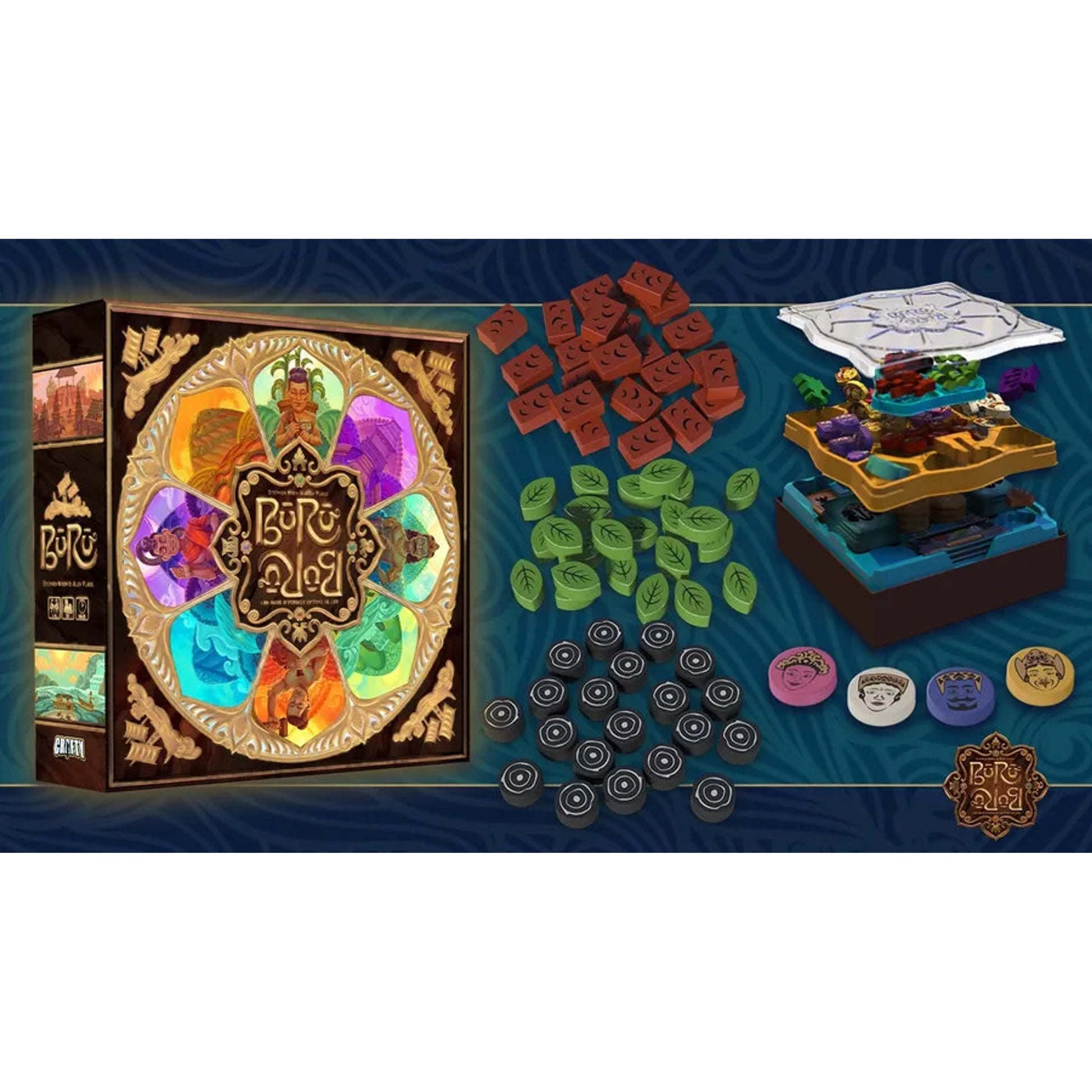 Buru is a mid-weight, Euro-style board game for 1-4 players. Over five game rounds, you and your fellow players secretly deploy explorers to the four different regions of the island in order to gather resources, recruit islanders, set them to tasks, and pay tribute to the spirits revered there. The object of the game is to win the islanders' esteem. You can earn esteem in many ways, primarily by paying tribute, but also by pleasing elders, tasking local nobles, fulfilling the king's decrees, and holding a totem when any player pays tribute to that spirit.