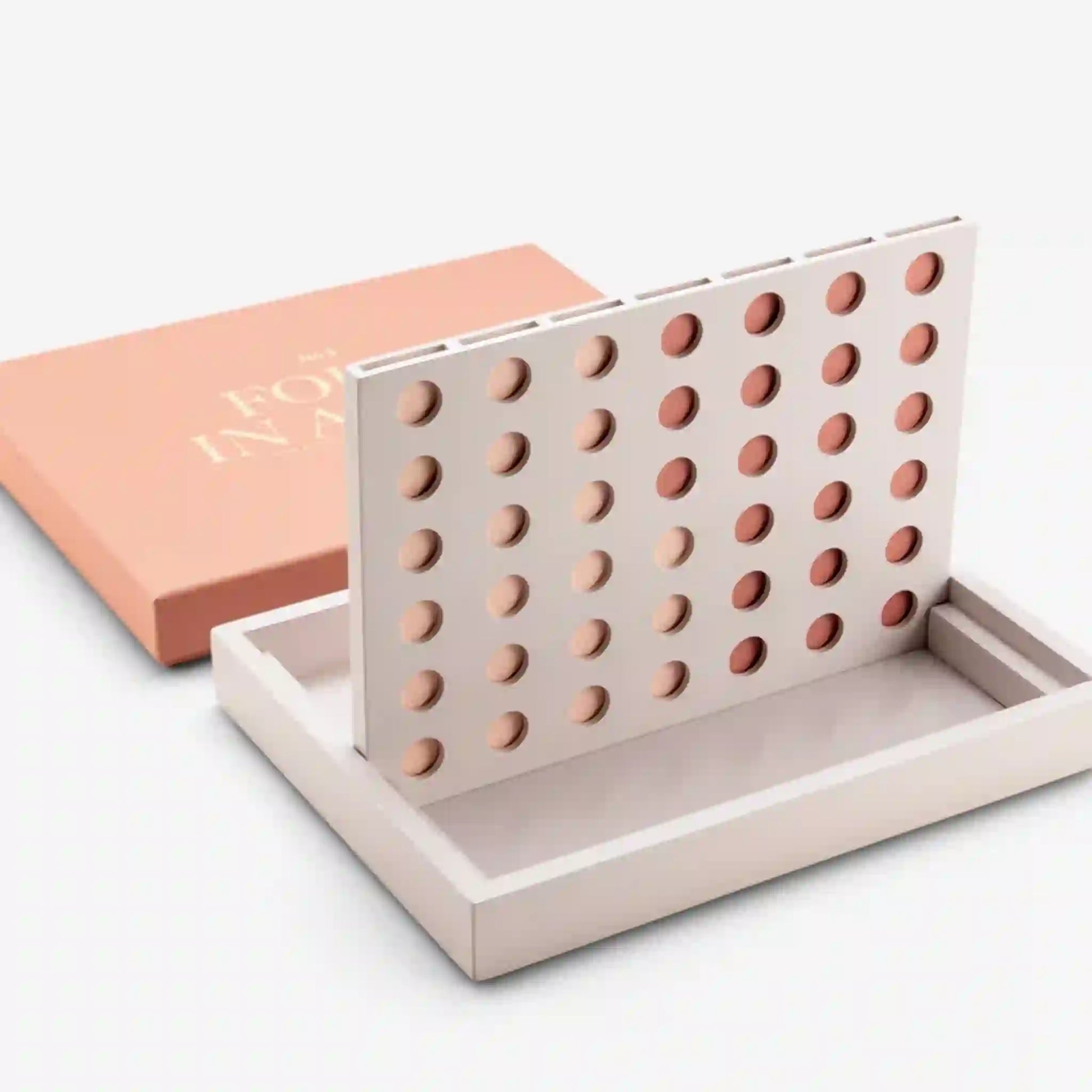 Explore the "Four in a Row" game with an exciting new twist. With a subtle color scheme and unique graphics, it adds a touch of vibrant fun to any home decor. This game is crafted from lacquered wood, boasting 42 playing discs (21 of each color). Its sturdy design folds into a compact shape for easy storage. It also includes easy-to-read instructions in English, French, and German. Perfect for two players aged 4+.