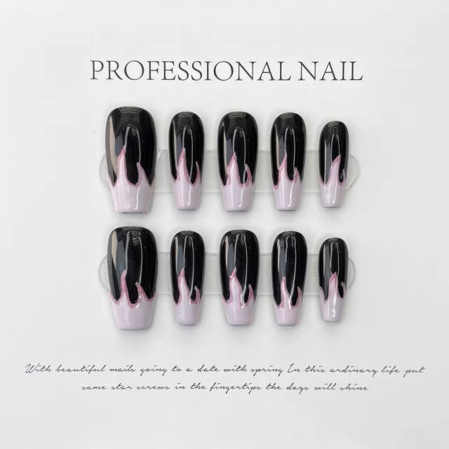 Discover the latest trendsetting wearable nail art with our Night Flame collection, blending cyberpunk futuristic elements and edgy Western style. Handcrafted to perfection, each piece features a striking pink and black flame design, ensuring you stand out with avant-garde charm.