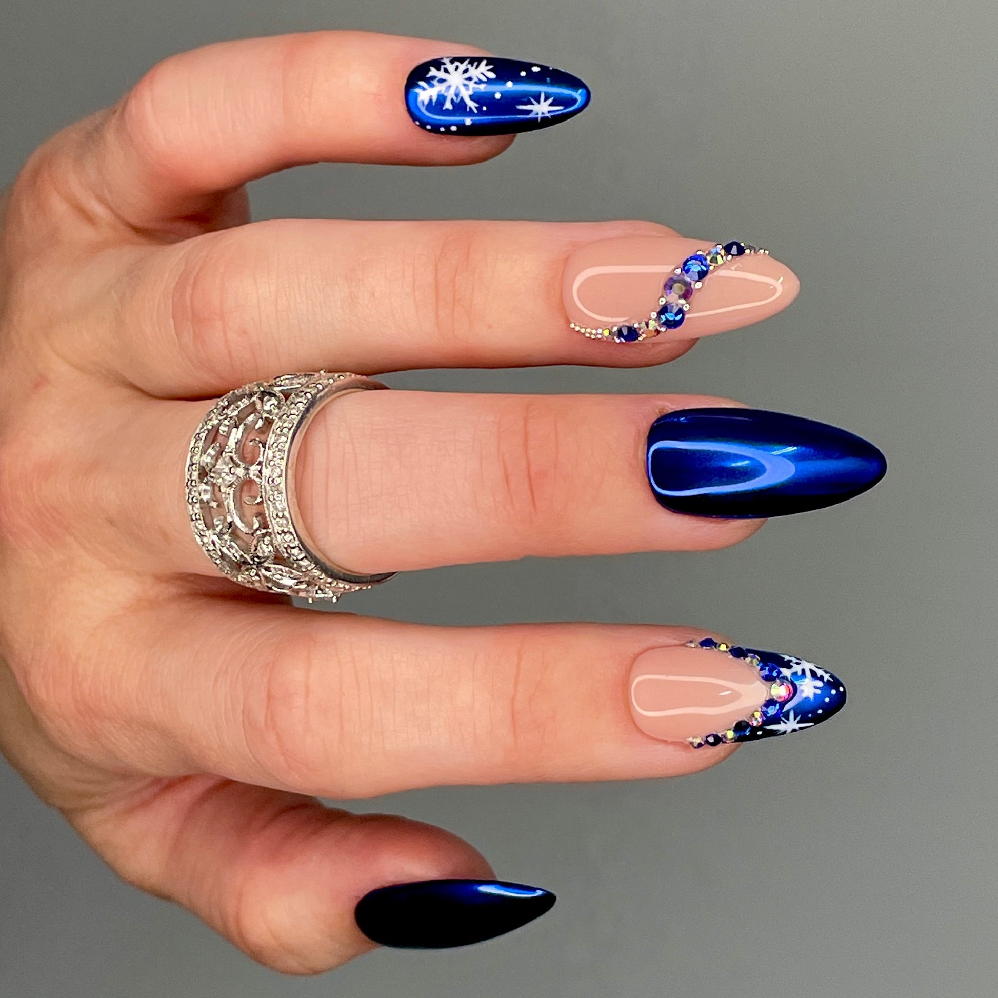 Blue chrome and natural nude winter holiday nails with snowflakes and glimmering rhinestone accents