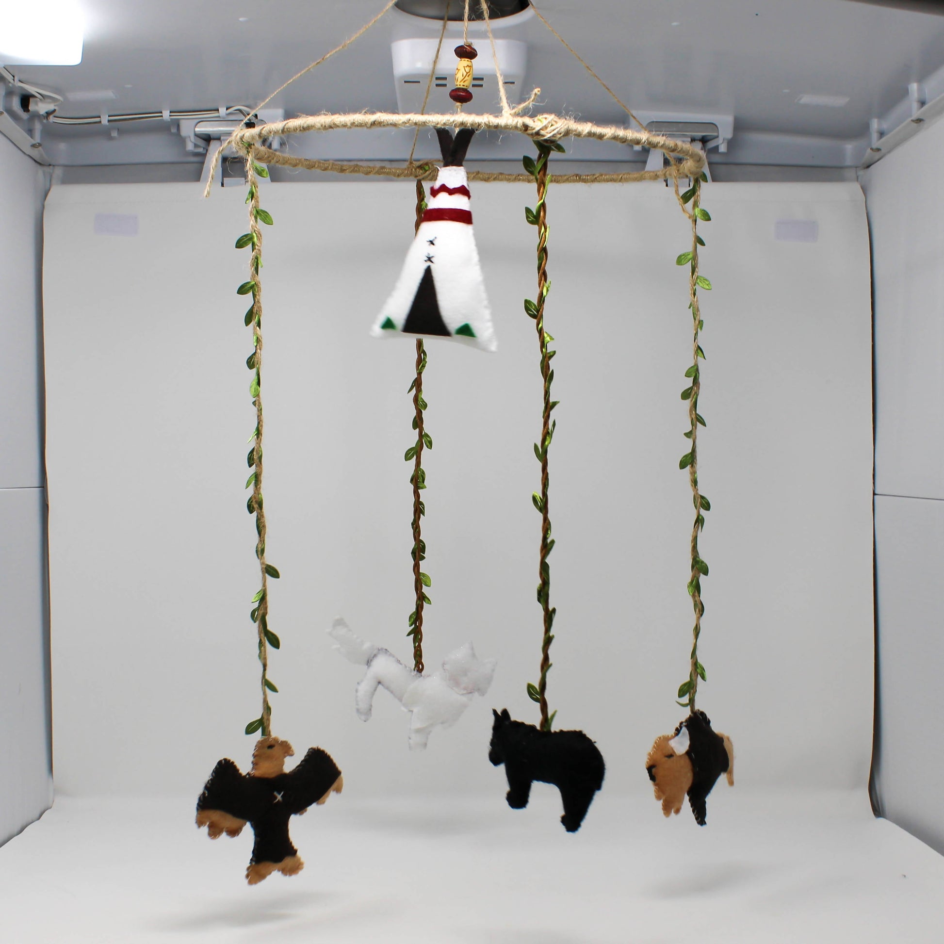 Hand sewn felt animals and Tipi on a baby mobile. Each part of it was hand made and crafted over several days. Perfect for over a childs crib or over a bed.