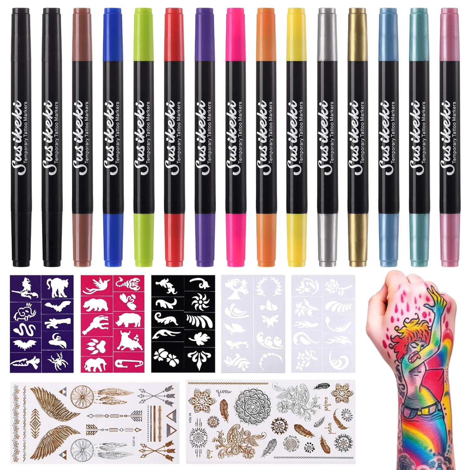 Temporary Tattoo Markers for Skin,15PCS Dual-Ended Tattoo Pen + 50 Paint Stencils + 43 Tattoos Stickers,Glitter & Matte & Neon Glow Body Marker Set, Removable Fake Tattoos Kit for Teens and Adult