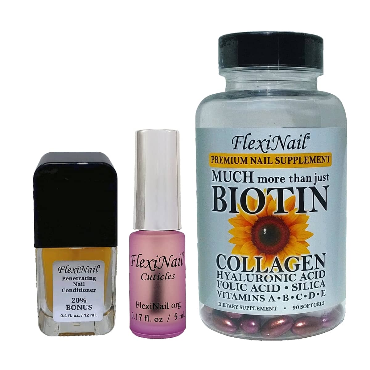 This package also include one bottle of FlexiNail "Much more than just Biotin" premium dietary nail supplement. MADE IN THE USA. The addition of collagen, silica, folic acid and more than 15 other vitamins, minerals and key ingredients helps reinforce the keratin structure and promotes healthy nails. This dietary supplement is a winning combination for stronger nails, improved skin elasticity and healthier looking hair.* (* This statement has not been evaluated by the Food and Drug Administration. This product is not intended to diagnose, treat, cure or prevent any disease.)