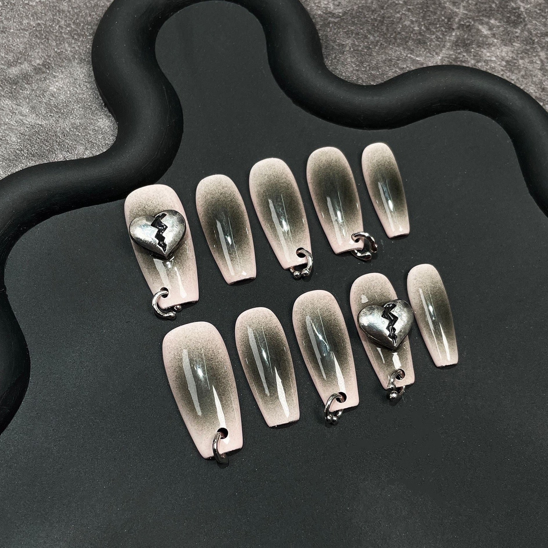 Product Description: Total Blackout】Handcrafted Wearable Nail Art with Gunmetal Finish, Edgy Nail Piercings, and Punk-inspired Nail Rings for a Bold and Unique Look